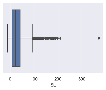 sns.boxplot(x='SL', data=op_data); # Create a default boxplot. The semi-colon is a trick to stop unwanted output on the terminal.