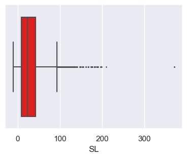 sns.boxplot(x='SL', data = op_data, color='red', fliersize=1.0);