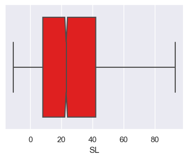 g = sns.boxplot(x='SL', data = op_data, color='red', fliersize=1.0, notch=True, sym="");