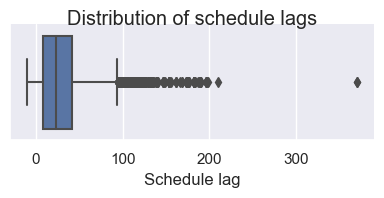 g.fig.suptitle('Distribution of schedule lags');