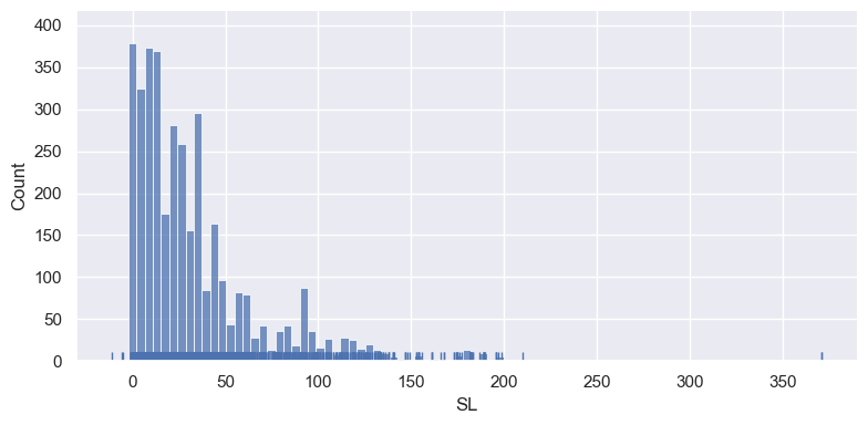 sns.displot(op_data['SL'], kde=False, rug=True,height=4, aspect=2); # Remove the kernel density estimate and add a rug plot.