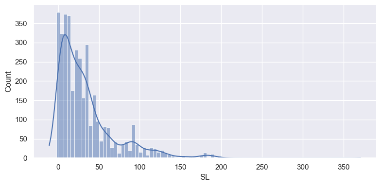 sns.displot(op_data['SL'], kde=True, height=4, aspect=2);