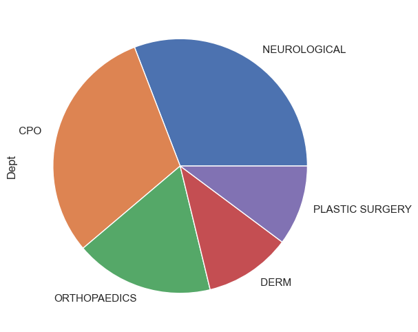 dept_counts.plot.pie(figsize=(6, 6)); # This is a pandas plot.