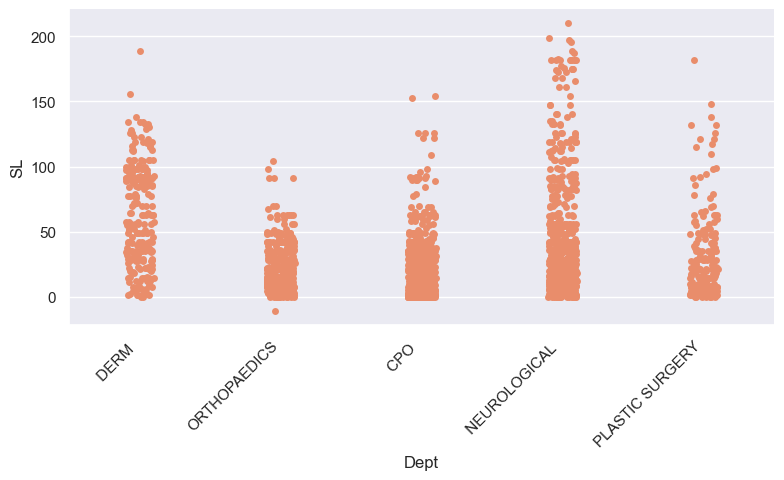 g = sns.catplot(x = 'Dept', y = "SL", data = new_dept, height=4, aspect=2) # The default "catplot"