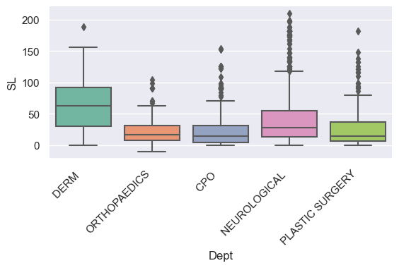 g = sns.catplot(x='Dept',y="SL", kind="box", data=new_dept, height=3, aspect=2) # The comparison boxplots