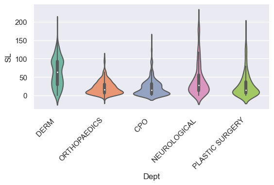 g = sns.catplot(x ='Dept', y="SL", kind="violin", data=new_dept, height=3, aspect=2) # The default "catplot"