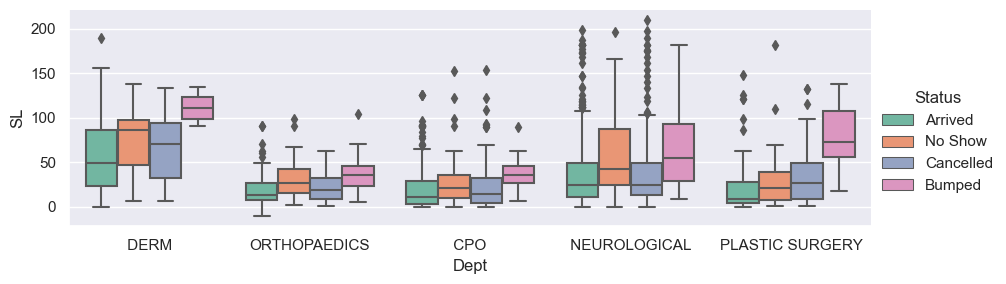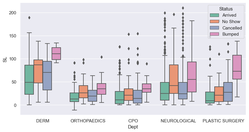 sns.boxplot(x = 'Dept', y = "SL", hue = 'Status', data = new_dept, ax=ax); # Note we are back to boxplot.