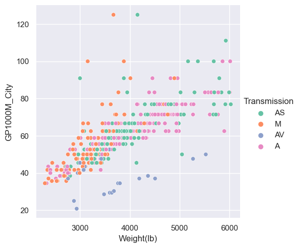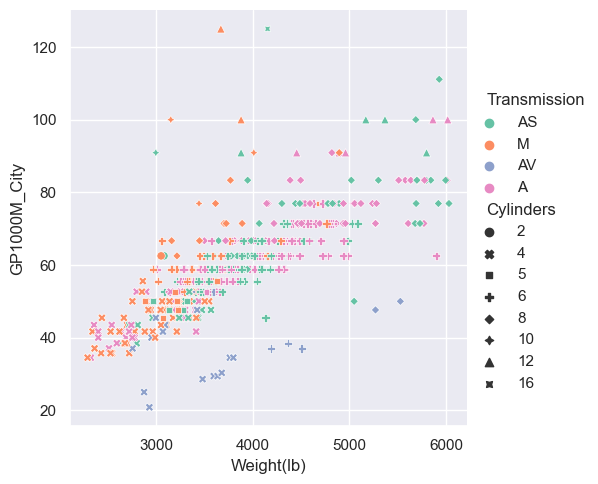 sns.relplot(x="Weight(lb)", y="GP1000M_City", hue = "Transmission", style="Cylinders", data=car_data);