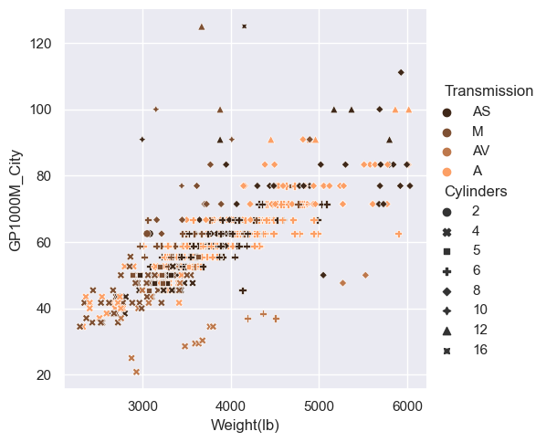 sns.relplot(x="Weight(lb)", y="GP1000M_City", hue="Transmission", style="Cylinders", palette="copper", data=car_data);