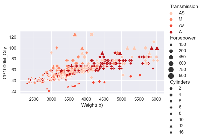 sizes=(20, 200), style="Cylinders", palette="Reds", data=car_data, height=3, aspect=2);