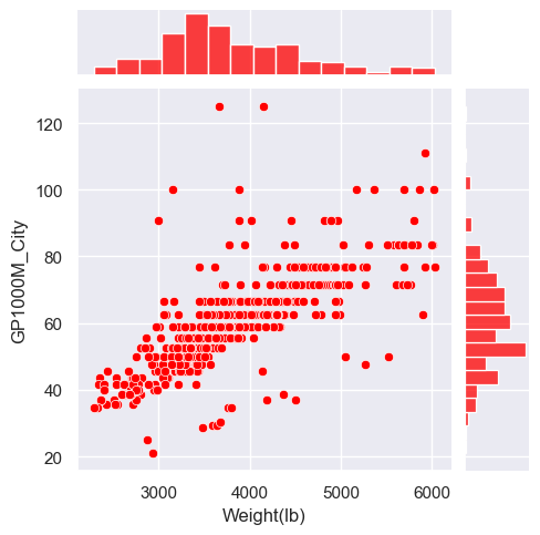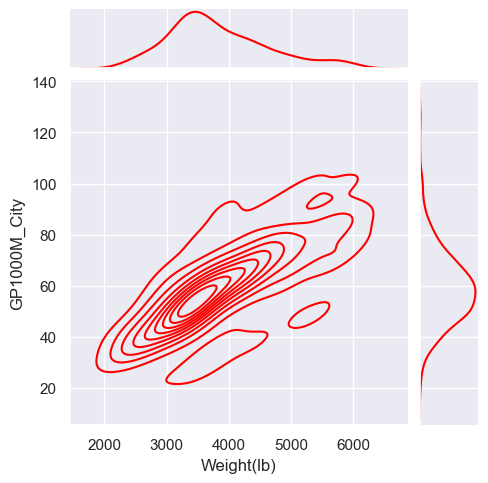 sns.jointplot(x="Weight(lb)", y="GP1000M_City", data=car_data, color="red", kind="kde", height=5);