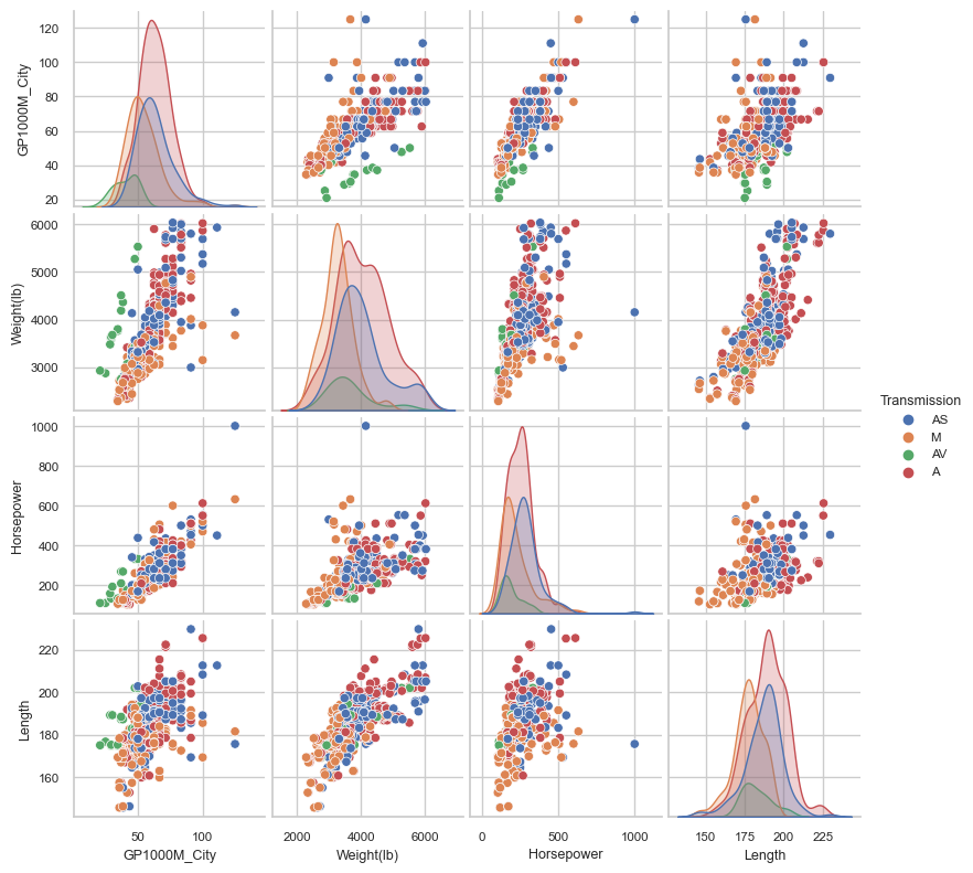 tmp_data = car_data[['GP1000M_City', 'Weight(lb)', 'Horsepower', 'Length', 'Transmission']]